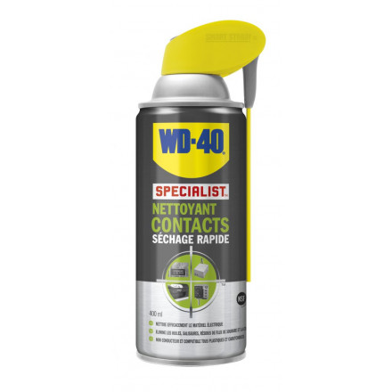 Le Nettoyant Contacts WD-40 Specialist dissout efficacement les huiles, dépôts gras, salissures, poussières, résidus de flux de soudure et la condensation sur les équipements électriques ou électroniques y compris le matériel délicat. Sa formule non conductrice et à évaporation rapide ne laisse aucun résidu et est compatible avec tous les métaux, plastiques et caoutchoucs.
